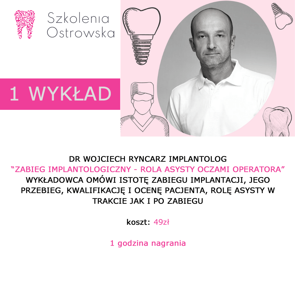 Dr podczas wykładu omówi  istotę zabiegu chirurgicznego i rolę asysty podczas zabiegu implantologicznego.